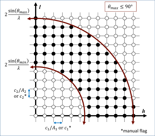 2Theta values = Min2Theta Max2Theta Min2Theta,Max2Theta = minimum and maximum 2 theta range to explore (radians or degrees) c values = c1 c2 c3 c1,c2,c3 = parameters to adjust the spacing of the reciprocal lattice nodes in the h, k, and l directions respectively LP value = switch to apply Lorentz-polarization factor 0/1 = off/on manual = flag to use manual spacing of reciprocal lattice points based on the values of the c parameters echo = flag to provide extra output for debugging purposes